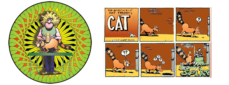 | Fat Freddy's Cat is much smarter than Freddy himself but sharing many of his preoccupations such as drugs, food, sleep and sex. Laid back but tending to regard others with amused contempt, frequently expressed by defecating in inappropriate and inconvenient places, like shoes and stereo headphones |